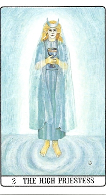 La Grande-Prêtresse porte sur sa tête les cornes d'Isis représentant les trois phases de la Lune : croissant, pleine lune et lune décroissante. Sur sa poitrine brille une croix à branches égales, symbole des dualités équilibrées : masculin/féminin, conscient/inconscient, matériel/spirituel.