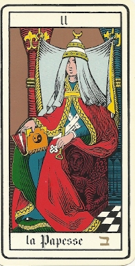 Court de Gébelin rebaptise donc la Papesse en "Grande-Prêtresse" (High Priestess en anglais). Pour lui, cette carte représente une prêtresse égyptienne mariée au Grand-Prêtre (l'ancien Pape). Cette idée du couple sacré égyptien remplace définitivement l'allégorie chrétienne de l'Église.