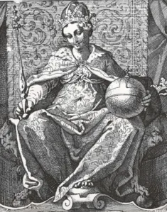 L'Allégorie du Pouvoir était traditionnellement représentée sous les traits d'une femme trônant avec les insignes impériaux, comme en témoigne la gravure d'Antonio Albizzi (1610). Cette iconographie classique explique pourquoi les premiers maîtres cartiers choisirent naturellement une figure féminine pour incarner l'autorité temporelle suprême, bien avant que l'Impératrice ne devienne symbole de maternité.